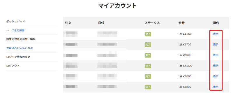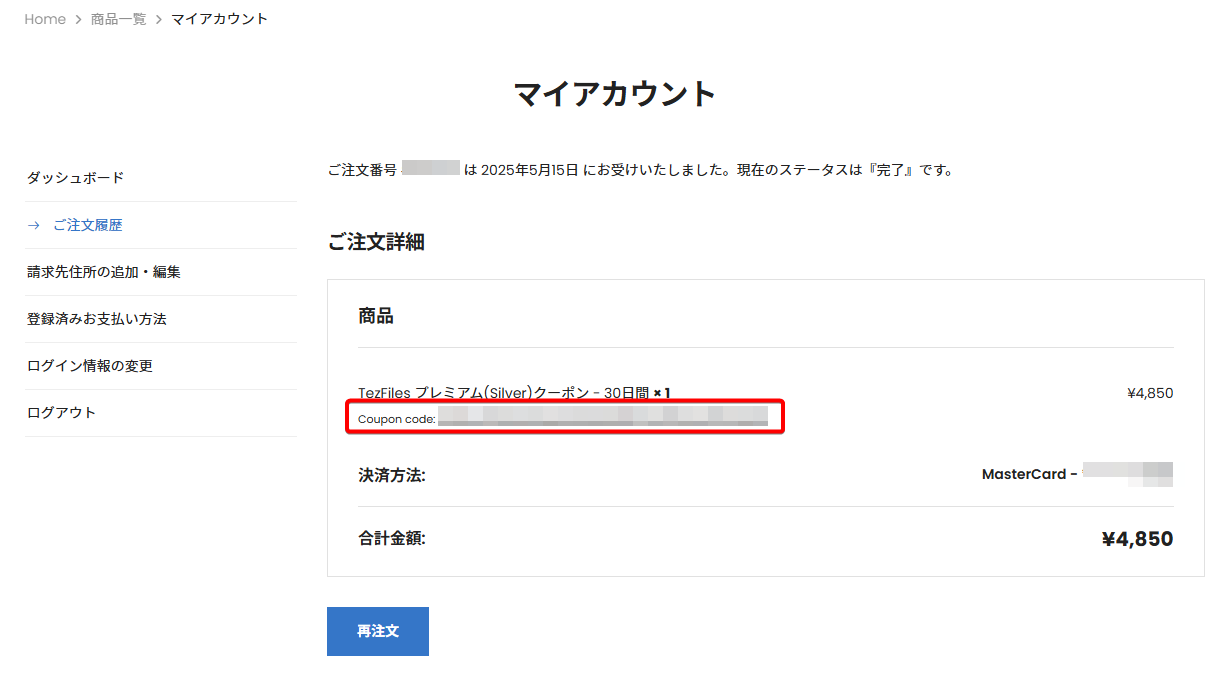 アカウントを作成済みの場合は、ログイン後「マイアカウント」→「ご注文」から今まで購入したプレミアムクーポンの履歴が参照できます。
