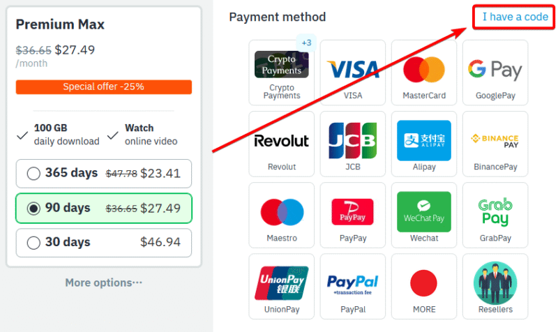 プラン一覧が表示されるので、上部にある「I have a code」をクリックします。