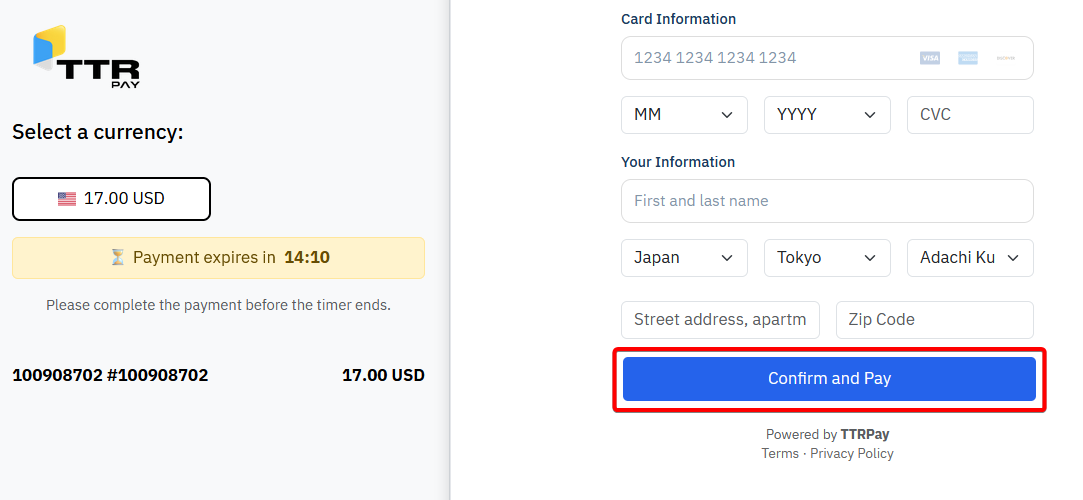 クレジットカード情報を入力して「Confirm and Pay」をクリックします。