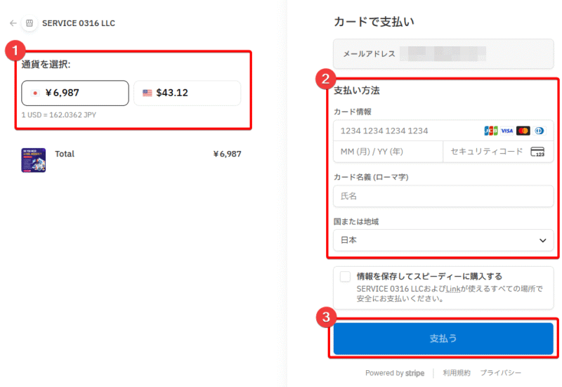 通貨を選択、クレジットカード情報を入力して「支払う」をクリックします。